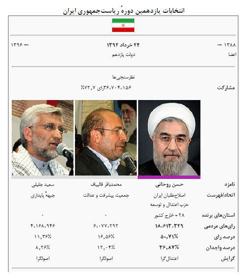 بر اساس اعلام ستاد انتخابات کشور ، حسن روحانی با بیشترین رای نسبت به رقبا، رییس جمهورِ منتخب اعلام شد.